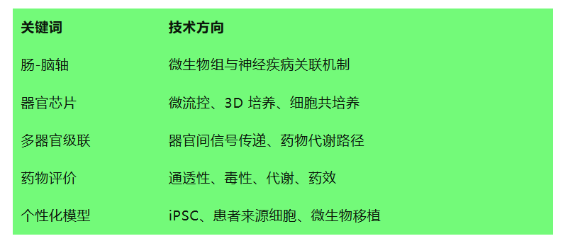 微生物-肠-脑轴与多器官芯片技术的融合路径,为神经系统疾病的机制研究与药物开发提供了新型体外模拟平台,是精准医学与替代动物实验的重要前沿方向。